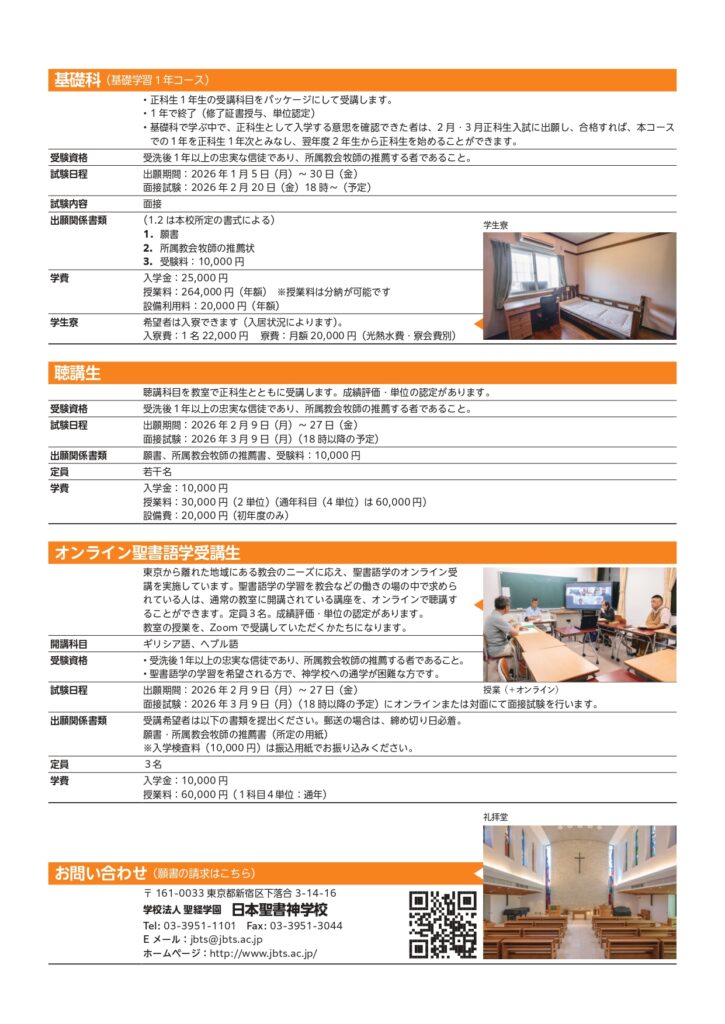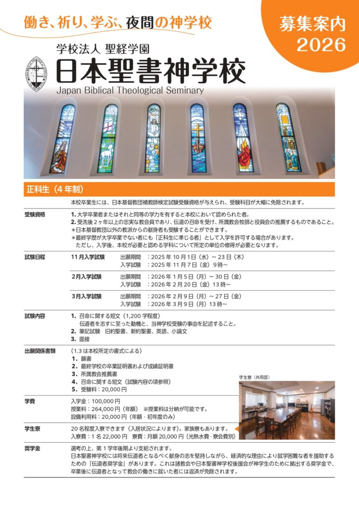 出願書類:願書、所属教会牧師の推薦書、受験料10,000円